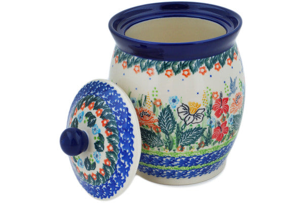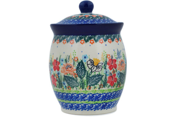 This Dove Escape 6" Jar with Lid was handmade and hand decorated in Boleslawiec, Poland by skilled artisans according to old traditional methods. This is a Polish pottery Signature Unikat, which means that it has been hand painted with both sponges and brushes and it is signed by the artist who painted it. Unikat pieces are the most intricate works of art. Larger Unikat items take hours of very careful work to finish. This Polish stoneware is microwave, dishwasher, freezer, and oven safe up to 480°F. It does not contain lead or cadmium. It is part of the Dove Escape Collection.