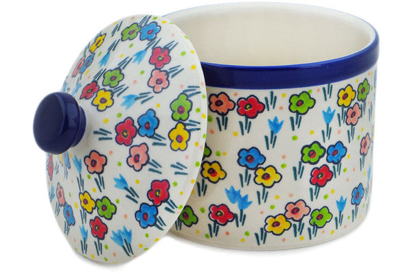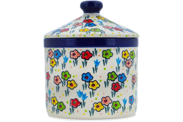 This Fun Time 6" Jar with Lid was handmade and hand decorated in Boleslawiec, Poland by skilled artisans according to old traditional methods. This is a Polish pottery Signature Unikat, which means that it has been hand painted with both sponges and brushes and it is signed by the artist who painted it. Unikat pieces are the most intricate works of art. Larger Unikat items take hours of very careful work to finish. This Polish stoneware is microwave, dishwasher, freezer, and oven safe up to 480°F. It does not contain lead or cadmium. It is part of the Fun Time Collection.