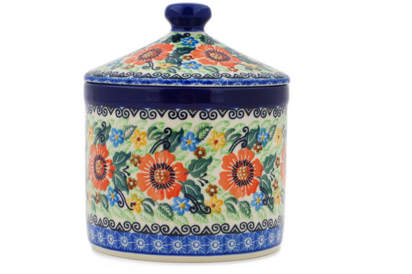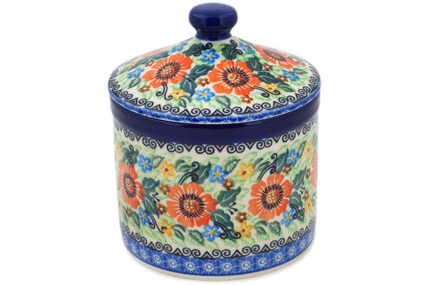 This Orange Wreath 6" Jar with Lid was handmade and hand decorated in Boleslawiec, Poland by skilled artisans according to old traditional methods. This is a Polish pottery Signature Unikat, which means that it has been hand painted with both sponges and brushes and it is signed by the artist who painted it. Unikat pieces are the most intricate works of art. Larger Unikat items take hours of very careful work to finish. This Polish stoneware is microwave, dishwasher, freezer, and oven safe up to 480°F. It does not contain lead or cadmium. It is part of the Orange Wreath Collection.
