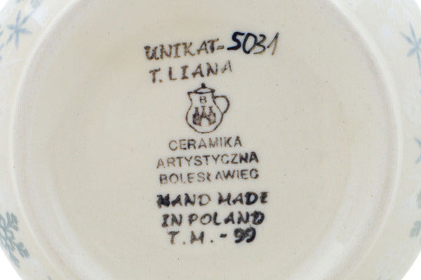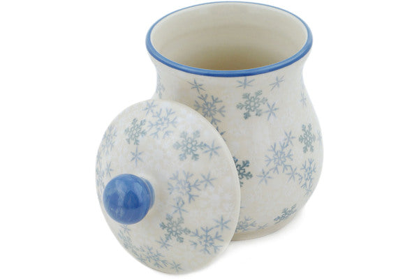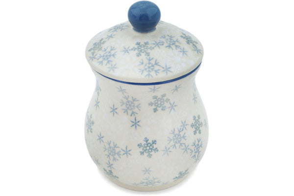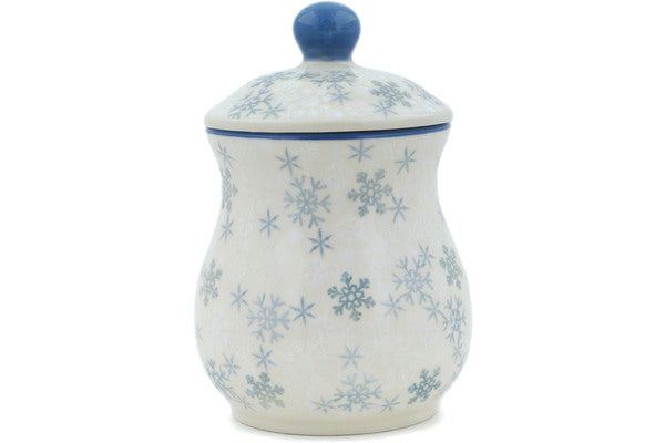 This Silver Snow Fall 6" Jar with Lid was handmade and hand decorated in Boleslawiec, Poland by skilled artisans according to old traditional methods. This is a Polish pottery Signature Unikat, which means that it has been hand painted with both sponges and brushes and it is signed by the artist who painted it. Unikat pieces are the most intricate works of art. Larger Unikat items take hours of very careful work to finish. This Polish stoneware is microwave, dishwasher, freezer, and oven safe up to 480°F. It does not contain lead or cadmium. It is part of the Silver Snow Fall Collection.