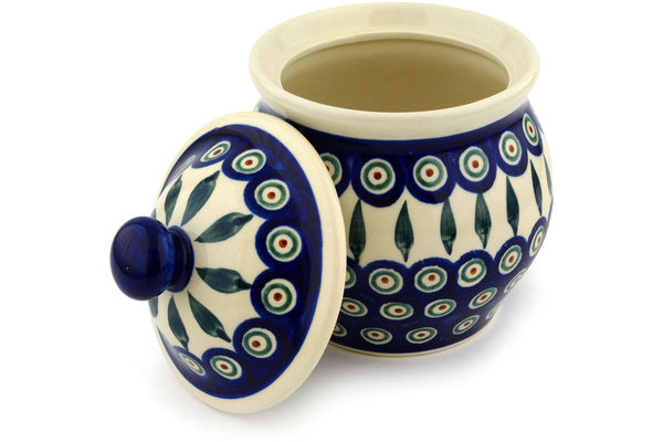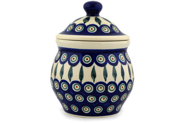 This Peacock Leaves 7" Jar with Lid was handmade and hand decorated in Boleslawiec, Poland by skilled artisans according to old traditional methods. This Polish stoneware is microwave, dishwasher, freezer, and oven safe up to 480°F. It does not contain lead or cadmium. It is part of the Peacock Leaves Collection.