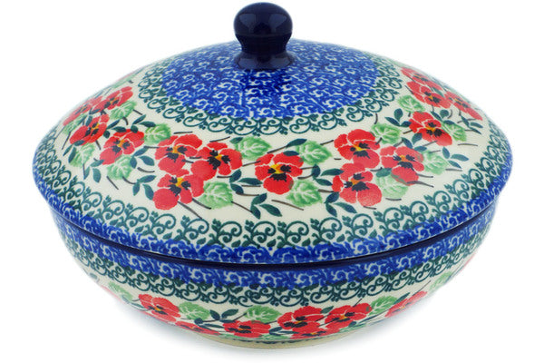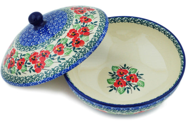 This Red Pansy 7" Jar with Lid was handmade and hand decorated in Boleslawiec, Poland by skilled artisans according to old traditional methods. This Polish stoneware is microwave, dishwasher, freezer, and oven safe up to 480°F. It does not contain lead or cadmium. It is part of the Red Pansy Collection.