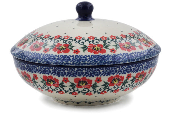 This Red Primrose 7" Jar with Lid was handmade and hand decorated in Boleslawiec, Poland by skilled artisans according to old traditional methods. This Polish stoneware is microwave, dishwasher, freezer, and oven safe up to 480°F. It does not contain lead or cadmium. It is part of the Red Primrose Collection.