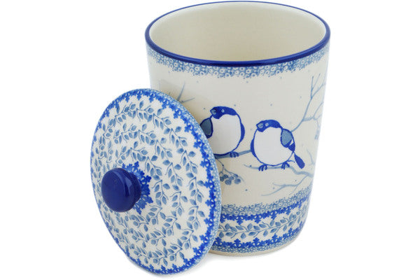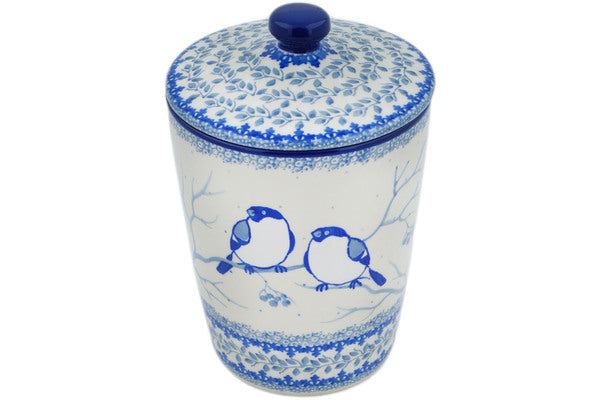This Waiting Birds 7" Jar with Lid was handmade and hand decorated in Boleslawiec, Poland by skilled artisans according to old traditional methods. This is a Polish pottery Signature Unikat, which means that it has been hand painted with both sponges and brushes and it is signed by the artist who painted it. Unikat pieces are the most intricate works of art. Larger Unikat items take hours of very careful work to finish. This Polish stoneware is microwave, dishwasher, freezer, and oven safe up to 480°F. It does not contain lead or cadmium. It is part of the Waiting Birds Collection.