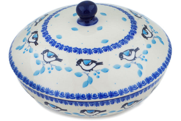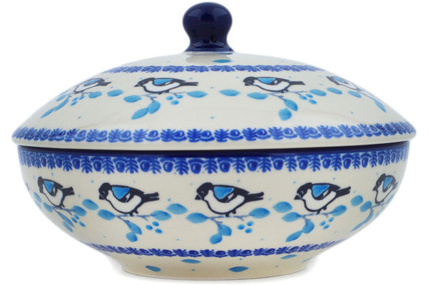 This Winter Sparrow 7" Jar with Lid was handmade and hand decorated in Boleslawiec, Poland by skilled artisans according to old traditional methods. This Polish stoneware is microwave, dishwasher, freezer, and oven safe up to 480°F. It does not contain lead or cadmium. It is part of the Winter Sparrow Collection.