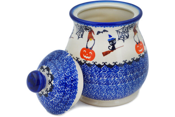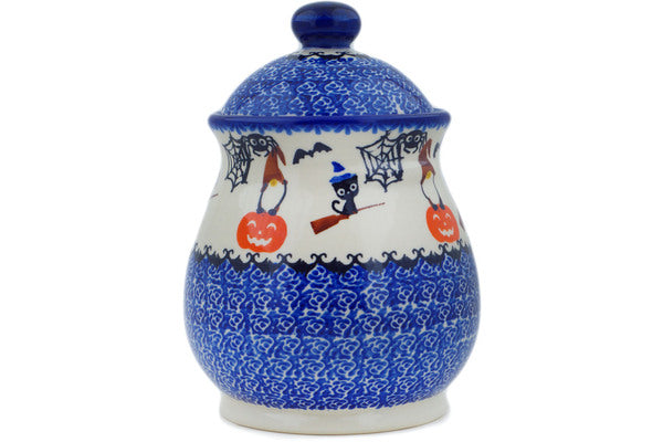 This Spooky Town 8" Jar with Lid was handmade and hand decorated in Boleslawiec, Poland by skilled artisans according to old traditional methods. This Polish stoneware is microwave, dishwasher, freezer, and oven safe up to 480°F. It does not contain lead or cadmium. It is part of the Spooky Town Collection.