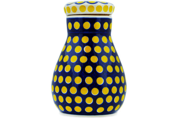 This Yellow Dots 8" Jar with Lid was handmade and hand decorated in Boleslawiec, Poland by skilled artisans according to old traditional methods. This Polish stoneware is microwave, dishwasher, freezer, and oven safe up to 480°F. It does not contain lead or cadmium. It is part of the Yellow Dots Collection.