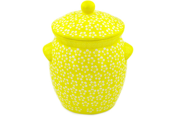 This Lemonade Field 11" Jar with Lid and Handles was handmade and hand decorated in Boleslawiec, Poland by skilled artisans according to old traditional methods. This is a Polish pottery Signature Unikat, which means that it has been hand painted with both sponges and brushes and it is signed by the artist who painted it. Unikat pieces are the most intricate works of art. Larger Unikat items take hours of very careful work to finish. This Polish stoneware is microwave, dishwasher, freezer, and oven safe up to 480°F. It does not contain lead or cadmium. It is part of the Lemonade Field Collection.