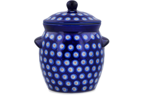 This Whirlpool 11" Jar with Lid and Handles was handmade and hand decorated in Boleslawiec, Poland by skilled artisans according to old traditional methods. This is a Polish pottery Signature Unikat, which means that it has been hand painted with both sponges and brushes and it is signed by the artist who painted it. Unikat pieces are the most intricate works of art. Larger Unikat items take hours of very careful work to finish. This Polish stoneware is microwave, dishwasher, freezer, and oven safe up to 480°F. It does not contain lead or cadmium. It is part of the Whirlpool Collection.