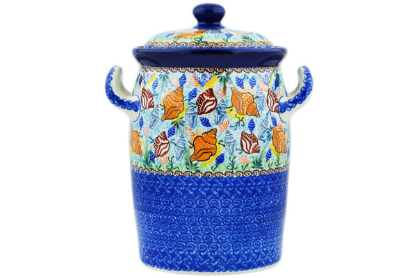 This Ocean Whisper 11" Jar with Lid and Handles was handmade and hand decorated in Boleslawiec, Poland by skilled artisans according to old traditional methods. This is a Polish pottery Signature Unikat, which means that it has been hand painted with both sponges and brushes and it is signed by the artist who painted it. Unikat pieces are the most intricate works of art. Larger Unikat items take hours of very careful work to finish. This Polish stoneware is microwave, dishwasher, freezer, and oven safe up to 480°F. It does not contain lead or cadmium. It is part of the Ocean Whisper Collection.