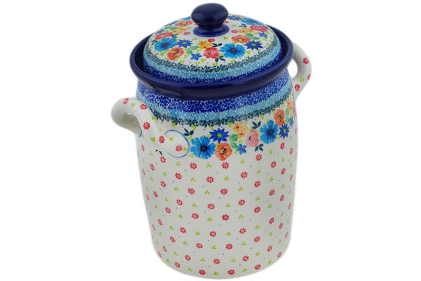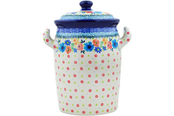 This Wreath Of Life 11" Jar with Lid and Handles was handmade and hand decorated in Boleslawiec, Poland by skilled artisans according to old traditional methods. This is a Polish pottery Signature Unikat, which means that it has been hand painted with both sponges and brushes and it is signed by the artist who painted it. Unikat pieces are the most intricate works of art. Larger Unikat items take hours of very careful work to finish. This Polish stoneware is microwave, dishwasher, freezer, and oven safe up to 480°F. It does not contain lead or cadmium. It is part of the Wreath Of Life Collection.