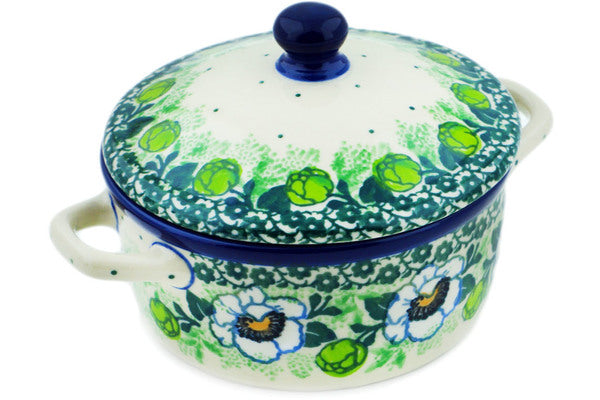 This Green Flora 5" Jar with Lid and Handles was handmade and hand decorated in Boleslawiec, Poland by skilled artisans according to old traditional methods. This Polish stoneware is microwave, dishwasher, freezer, and oven safe up to 480°F. It does not contain lead or cadmium. It is part of the Green Flora Collection.