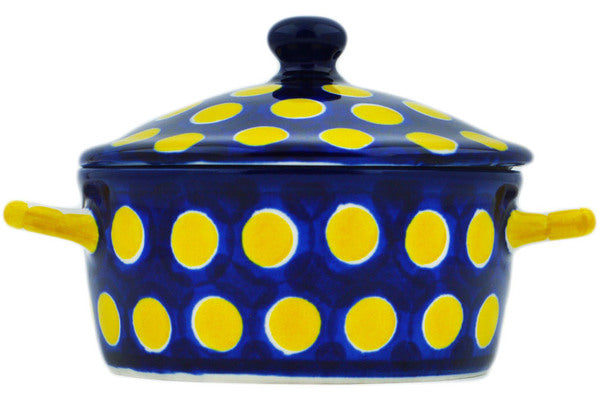 This Yellow Dots 5" Jar with Lid and Handles was handmade and hand decorated in Boleslawiec, Poland by skilled artisans according to old traditional methods. This Polish stoneware is microwave, dishwasher, freezer, and oven safe up to 480°F. It does not contain lead or cadmium. It is part of the Yellow Dots Collection.