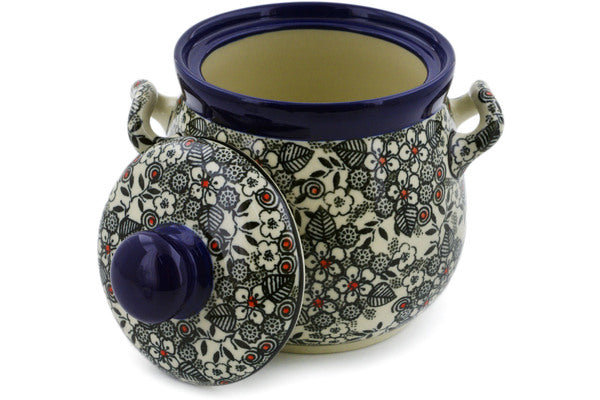 This Classic Black And White 6" Jar with Lid and Handles was handmade and hand decorated in Boleslawiec, Poland by skilled artisans according to old traditional methods. This is a Polish pottery Signature Unikat, which means that it has been hand painted with both sponges and brushes and it is signed by the artist who painted it. Unikat pieces are the most intricate works of art. Larger Unikat items take hours of very careful work to finish. This Polish stoneware is microwave, dishwasher, freezer, and oven safe up to 480°F. It does not contain lead or cadmium. It is part of the Classic Black And White Collection.