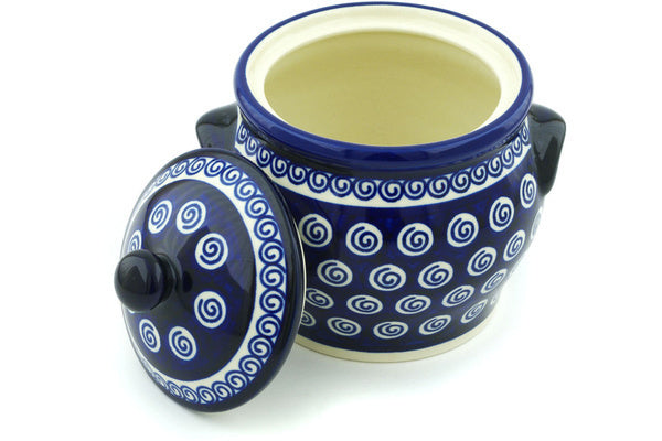 This Cobalt Swirl 6" Jar with Lid and Handles was handmade and hand decorated in Boleslawiec, Poland by skilled artisans according to old traditional methods. This Polish stoneware is microwave, dishwasher, freezer, and oven safe up to 480°F. It does not contain lead or cadmium. It is part of the Cobalt Swirl Collection.