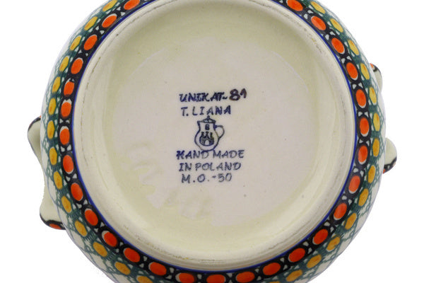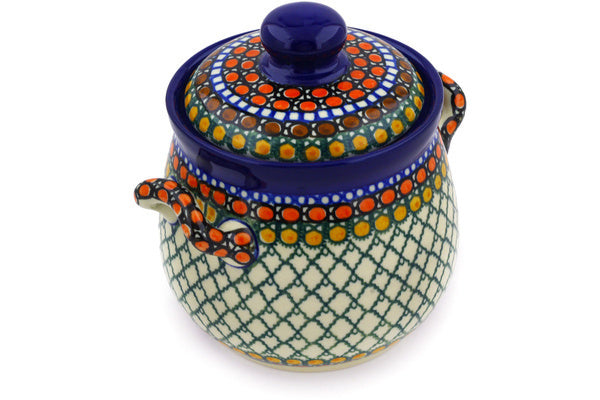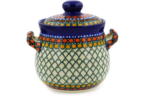 This Orange Tranquility 6" Jar with Lid and Handles was handmade and hand decorated in Boleslawiec, Poland by skilled artisans according to old traditional methods. This is a Polish pottery Signature Unikat, which means that it has been hand painted with both sponges and brushes and it is signed by the artist who painted it. Unikat pieces are the most intricate works of art. Larger Unikat items take hours of very careful work to finish. This Polish stoneware is microwave, dishwasher, freezer, and oven safe up to 480°F. It does not contain lead or cadmium. It is part of the Orange Tranquility Collection.