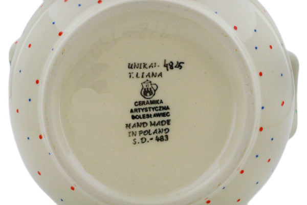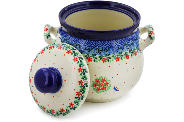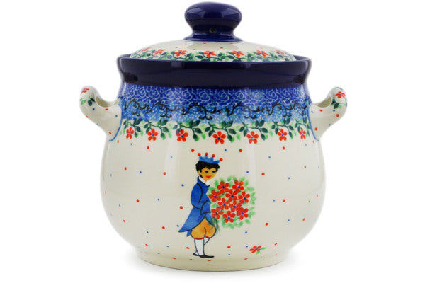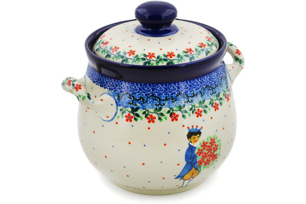 This Charming Prince 7" Jar with Lid and Handles was handmade and hand decorated in Boleslawiec, Poland by skilled artisans according to old traditional methods. This is a Polish pottery Signature Unikat, which means that it has been hand painted with both sponges and brushes and it is signed by the artist who painted it. Unikat pieces are the most intricate works of art. Larger Unikat items take hours of very careful work to finish. This Polish stoneware is microwave, dishwasher, freezer, and oven safe up to 480°F. It does not contain lead or cadmium. It is part of the Charming Prince Collection.