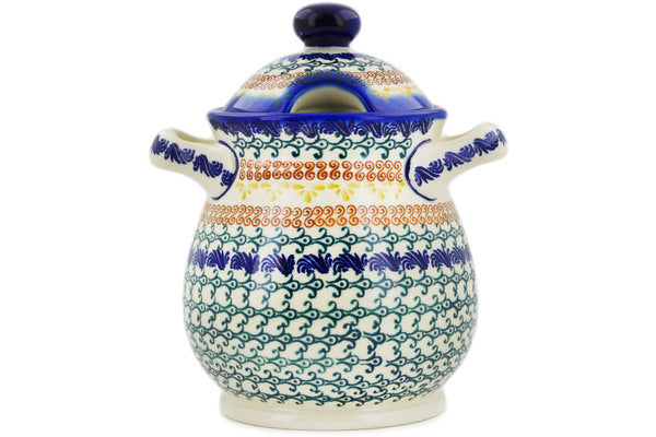 This Autumn Swirls 8" Jar with Lid and Handles was handmade and hand decorated in Boleslawiec, Poland by skilled artisans according to old traditional methods. This Polish stoneware is microwave, dishwasher, freezer, and oven safe up to 480°F. It does not contain lead or cadmium. It is part of the Autumn Swirls Collection.
