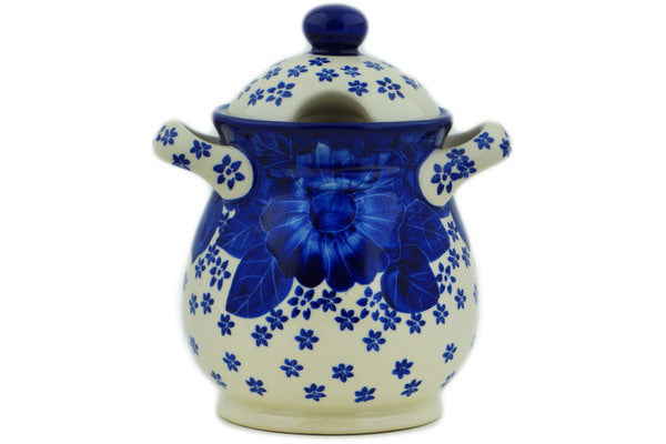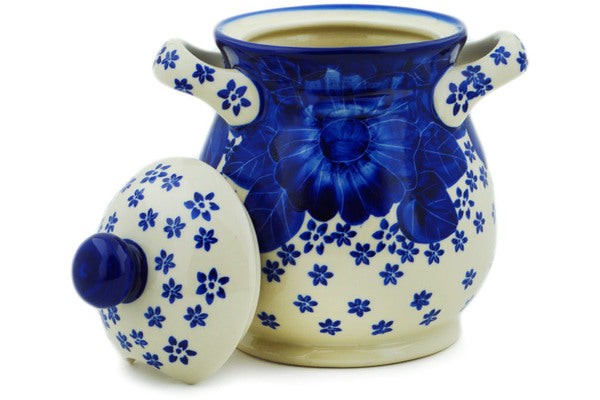 This Divine Cobalt 8" Jar with Lid and Handles was handmade and hand decorated in Boleslawiec, Poland by skilled artisans according to old traditional methods. This is a Polish pottery Signature Unikat, which means that it has been hand painted with both sponges and brushes and it is signed by the artist who painted it. Unikat pieces are the most intricate works of art. Larger Unikat items take hours of very careful work to finish. This Polish stoneware is microwave, dishwasher, freezer, and oven safe up to 480°F. It does not contain lead or cadmium. It is part of the Divine Cobalt Collection.