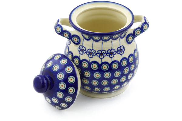 This Flowering Peacock 8" Jar with Lid and Handles was handmade and hand decorated in Boleslawiec, Poland by skilled artisans according to old traditional methods. This Polish stoneware is microwave, dishwasher, freezer, and oven safe up to 480°F. It does not contain lead or cadmium. It is part of the Flowering Peacock Collection.