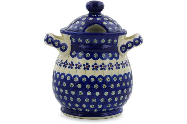This Flowering Peacock 8" Jar with Lid and Handles was handmade and hand decorated in Boleslawiec, Poland by skilled artisans according to old traditional methods. This Polish stoneware is microwave, dishwasher, freezer, and oven safe up to 480°F. It does not contain lead or cadmium. It is part of the Flowering Peacock Collection.