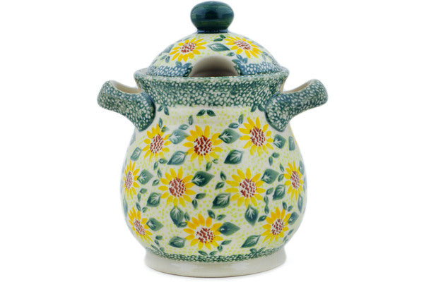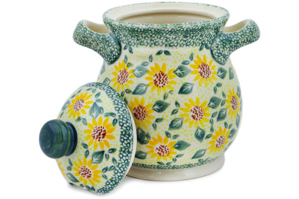 This Sunflower Fields 8" Jar with Lid and Handles was handmade and hand decorated in Boleslawiec, Poland by skilled artisans according to old traditional methods. This Polish stoneware is microwave, dishwasher, freezer, and oven safe up to 480°F. It does not contain lead or cadmium. It is part of the Sunflower Fields Collection.