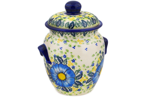 This Blue Happy Fields 9" Jar with Lid and Handles was handmade and hand decorated in Boleslawiec, Poland by skilled artisans according to old traditional methods. This is a Polish pottery Signature Unikat, which means that it has been hand painted with both sponges and brushes and it is signed by the artist who painted it. Unikat pieces are the most intricate works of art. Larger Unikat items take hours of very careful work to finish. This Polish stoneware is microwave, dishwasher, freezer, and oven safe up to 480°F. It does not contain lead or cadmium. It is part of the Blue Happy Fields Collection.