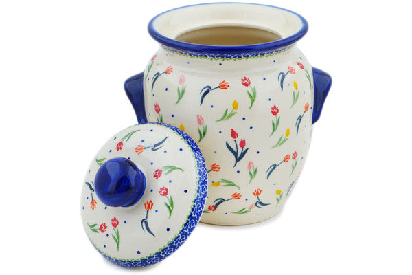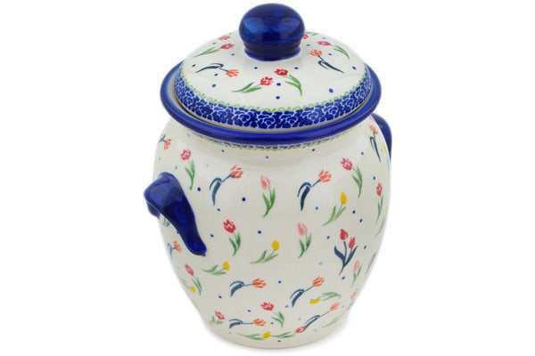 This Tulip Meadow 9" Jar with Lid and Handles was handmade and hand decorated in Boleslawiec, Poland by skilled artisans according to old traditional methods. This Polish stoneware is microwave, dishwasher, freezer, and oven safe up to 480°F. It does not contain lead or cadmium. It is part of the Tulip Meadow Collection.