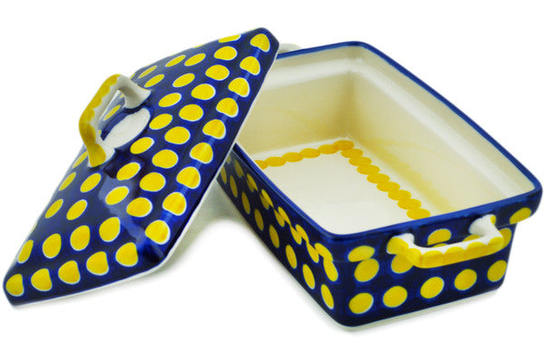 This Yellow Dots 9" Jar with Lid and Handles was handmade and hand decorated in Boleslawiec, Poland by skilled artisans according to old traditional methods. This Polish stoneware is microwave, dishwasher, freezer, and oven safe up to 480°F. It does not contain lead or cadmium. It is part of the Yellow Dots Collection.