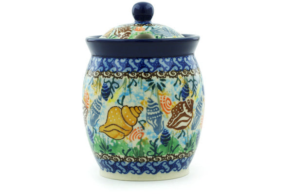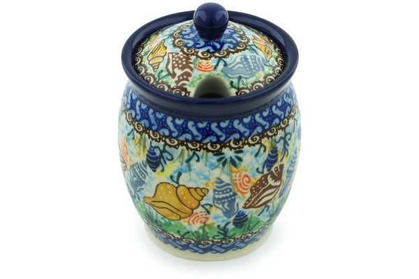 This Ocean Whisper 5" Jar with Lid with Opening was handmade and hand decorated in Boleslawiec, Poland by skilled artisans according to old traditional methods. This is a Polish pottery Signature Unikat, which means that it has been hand painted with both sponges and brushes and it is signed by the artist who painted it. Unikat pieces are the most intricate works of art. Larger Unikat items take hours of very careful work to finish. This Polish stoneware is microwave, dishwasher, freezer, and oven safe up to 480°F. It does not contain lead or cadmium. It is part of the Ocean Whisper Collection.