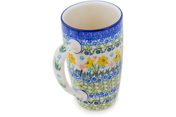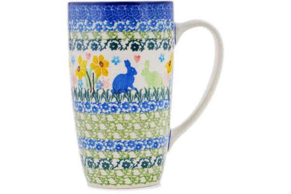 This Hopping In Love 14 oz Latte Mug was handmade and hand decorated in Boleslawiec, Poland by skilled artisans according to old traditional methods. This Polish stoneware is microwave, dishwasher, freezer, and oven safe up to 480°F. It does not contain lead or cadmium. It is part of the Hopping In Love Collection.