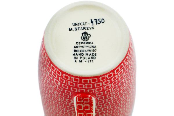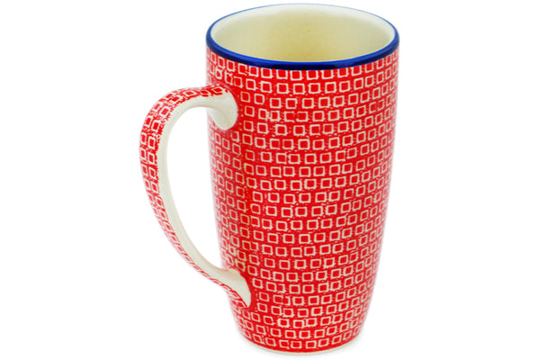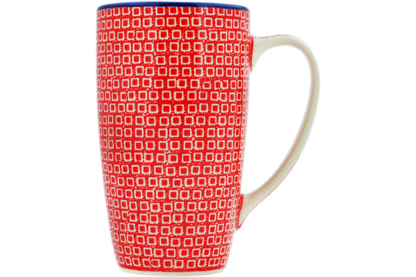 This Red Squares 14 oz Latte Mug was handmade and hand decorated in Boleslawiec, Poland by skilled artisans according to old traditional methods. This is a Polish pottery Signature Unikat, which means that it has been hand painted with both sponges and brushes and it is signed by the artist who painted it. Unikat pieces are the most intricate works of art. Larger Unikat items take hours of very careful work to finish. This Polish stoneware is microwave, dishwasher, freezer, and oven safe up to 480°F. It does not contain lead or cadmium. It is part of the Red Squares Collection.