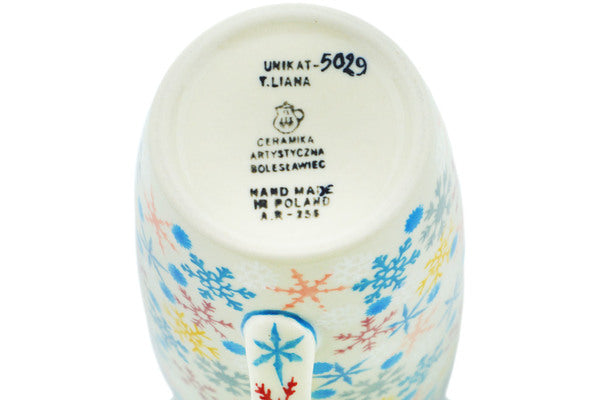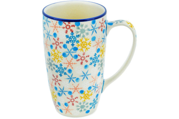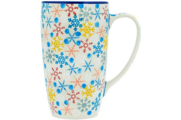 This Vintage Snow Fall 14 oz Latte Mug was handmade and hand decorated in Boleslawiec, Poland by skilled artisans according to old traditional methods. This is a Polish pottery Signature Unikat, which means that it has been hand painted with both sponges and brushes and it is signed by the artist who painted it. Unikat pieces are the most intricate works of art. Larger Unikat items take hours of very careful work to finish. This Polish stoneware is microwave, dishwasher, freezer, and oven safe up to 480°F. It does not contain lead or cadmium. It is part of the Vintage Snow Fall Collection.