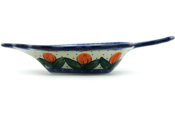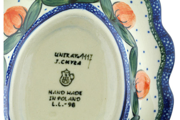 This Red Tulip Circle 10" Leaf Shaped Bowl was handmade and hand decorated in Boleslawiec, Poland by skilled artisans according to old traditional methods. This is a Polish pottery Signature Unikat, which means that it has been hand painted with both sponges and brushes and it is signed by the artist who painted it. Unikat pieces are the most intricate works of art. Larger Unikat items take hours of very careful work to finish. This Polish stoneware is microwave, dishwasher, freezer, and oven safe up to 480°F. It does not contain lead or cadmium. It is part of the Red Tulip Circle Collection.
