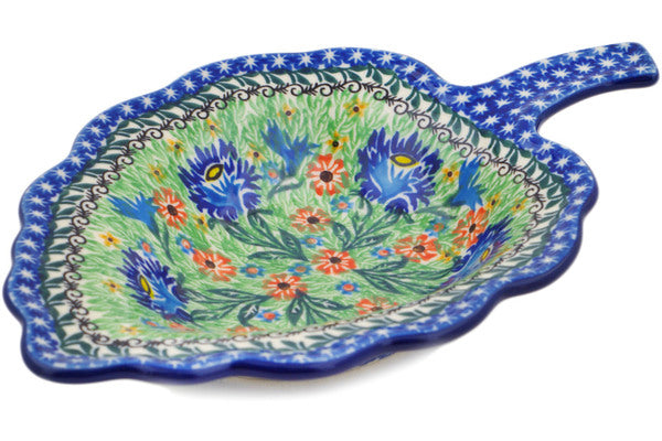 This Sprouting Cupids 10" Leaf Shaped Bowl was handmade and hand decorated in Boleslawiec, Poland by skilled artisans according to old traditional methods. This is a Polish pottery Signature Unikat, which means that it has been hand painted with both sponges and brushes and it is signed by the artist who painted it. Unikat pieces are the most intricate works of art. Larger Unikat items take hours of very careful work to finish. This Polish stoneware is microwave, dishwasher, freezer, and oven safe up to 480°F. It does not contain lead or cadmium. It is part of the Sprouting Cupids Collection.