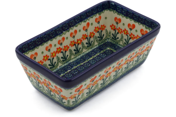 This Peach Spring Daisy 8" Loaf Pan 8" was handmade and hand decorated in Boleslawiec, Poland by skilled artisans according to old traditional methods. This Polish stoneware is microwave, dishwasher, freezer, and oven safe up to 480°F. It does not contain lead or cadmium. It is part of the Peach Spring Daisy Collection.