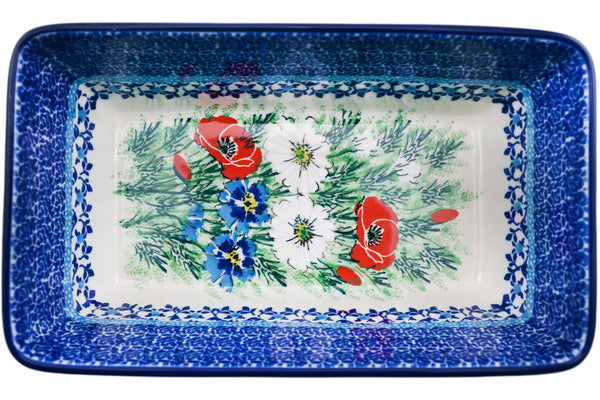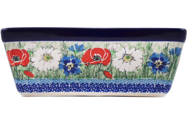 This Polish Fields 8" Loaf Pan 8" was handmade and hand decorated in Boleslawiec, Poland by skilled artisans according to old traditional methods. This is a Polish pottery Signature Unikat, which means that it has been hand painted with both sponges and brushes and it is signed by the artist who painted it. Unikat pieces are the most intricate works of art. Larger Unikat items take hours of very careful work to finish. This Polish stoneware is microwave, dishwasher, freezer, and oven safe up to 480°F. It does not contain lead or cadmium. It is part of the Polish Fields Collection.