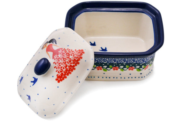 This Bird Princess 4" Mini Cake Box 4", Salt Box, was handmade and hand decorated in Boleslawiec, Poland by skilled artisans according to old traditional methods. This Polish stoneware is microwave, dishwasher, freezer, and oven safe up to 480°F. It does not contain lead or cadmium. It is part of the Bird Princess Collection.