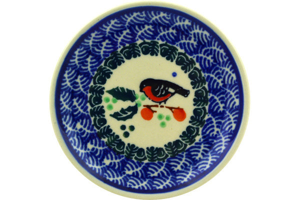 This Christmas Chickadee 4" Mini Plate, Coaster plate was handmade and hand decorated in Boleslawiec, Poland by skilled artisans according to old traditional methods. This Polish stoneware is microwave, dishwasher, freezer, and oven safe up to 480°F. It does not contain lead or cadmium. It is part of the Christmas Chickadee Collection.