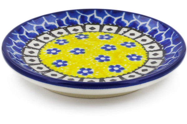 This Sunburst Daisies 4" Mini Plate, Coaster plate was handmade and hand decorated in Boleslawiec, Poland by skilled artisans according to old traditional methods. This Polish stoneware is microwave, dishwasher, freezer, and oven safe up to 480°F. It does not contain lead or cadmium. It is part of the Sunburst Daisies Collection.