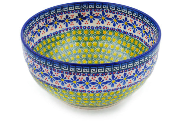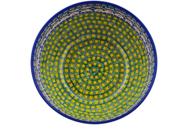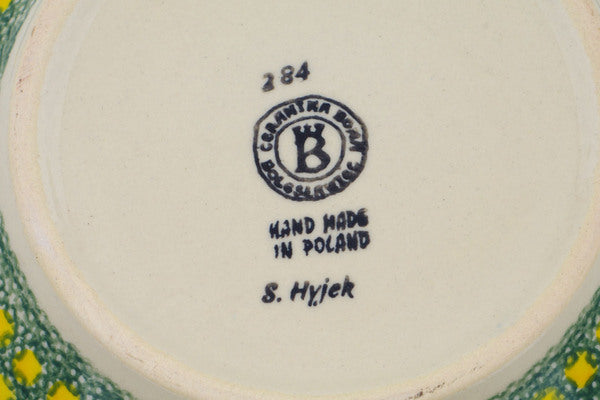 This Irish Spring 9" Mixing bowl, serving bowl was handmade and hand decorated in Boleslawiec, Poland by skilled artisans according to old traditional methods. This Polish stoneware is microwave, dishwasher, freezer, and oven safe up to 480°F. It does not contain lead or cadmium. It is part of the Irish Spring Collection.
