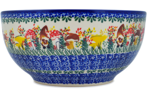 This Mushroom Love 9" Mixing bowl, serving bowl was handmade and hand decorated in Boleslawiec, Poland by skilled artisans according to old traditional methods. This is a Polish pottery Signature Unikat, which means that it has been hand painted with both sponges and brushes and it is signed by the artist who painted it. Unikat pieces are the most intricate works of art. Larger Unikat items take hours of very careful work to finish. This Polish stoneware is microwave, dishwasher, freezer, and oven safe up to 480°F. It does not contain lead or cadmium. It is part of the Mushroom Love Collection.