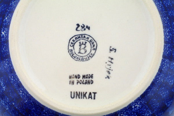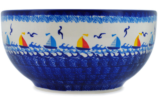 This Sailing Through Your Dreams 9" Mixing bowl, serving bowl was handmade and hand decorated in Boleslawiec, Poland by skilled artisans according to old traditional methods. This Polish stoneware is microwave, dishwasher, freezer, and oven safe up to 480°F. It does not contain lead or cadmium. It is part of the Sailing Through Your Dreams Collection.