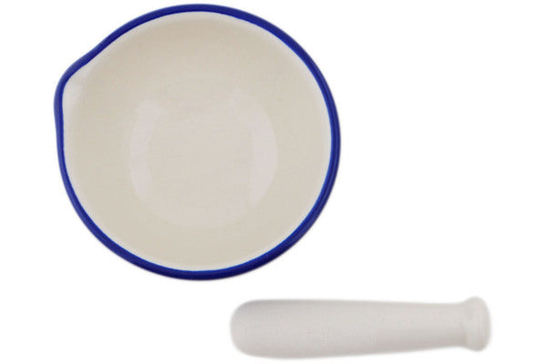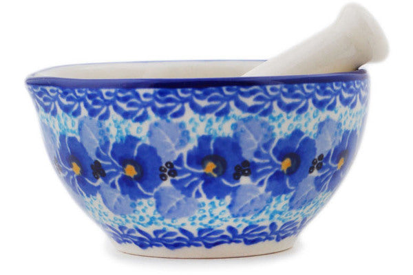 This Deep Winter Small Mortar and Pestle was handmade and hand decorated in Boleslawiec, Poland by skilled artisans according to old traditional methods. This is a Polish pottery Signature Unikat, which means that it has been hand painted with both sponges and brushes and it is signed by the artist who painted it. Unikat pieces are the most intricate works of art. Larger Unikat items take hours of very careful work to finish. This Polish stoneware is microwave, dishwasher, freezer, and oven safe up to 480°F. It does not contain lead or cadmium. It is part of the Deep Winter Collection.