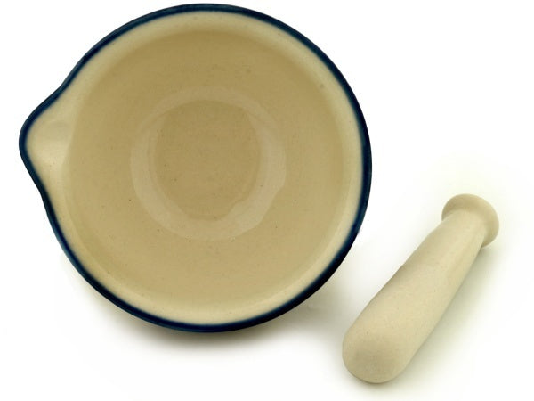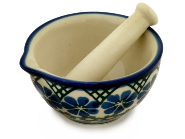 This Primrose Trellis Small Mortar and Pestle was handmade and hand decorated in Boleslawiec, Poland by skilled artisans according to old traditional methods. This Polish stoneware is microwave, dishwasher, freezer, and oven safe up to 480°F. It does not contain lead or cadmium. It is part of the Primrose Trellis Collection.