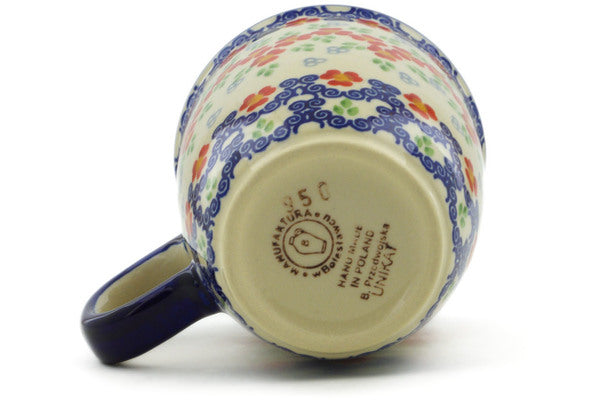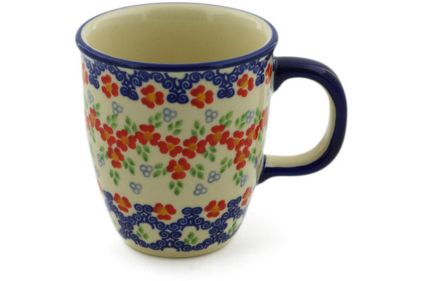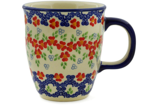 This Red Chains 10 oz Mug was handmade and hand decorated in Boleslawiec, Poland by skilled artisans according to old traditional methods. This is a Polish pottery Signature Unikat, which means that it has been hand painted with both sponges and brushes and it is signed by the artist who painted it. Unikat pieces are the most intricate works of art. Larger Unikat items take hours of very careful work to finish. This Polish stoneware is microwave, dishwasher, freezer, and oven safe up to 480°F. It does not contain lead or cadmium. It is part of the Red Chains Collection.
