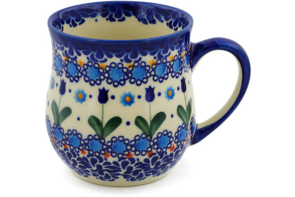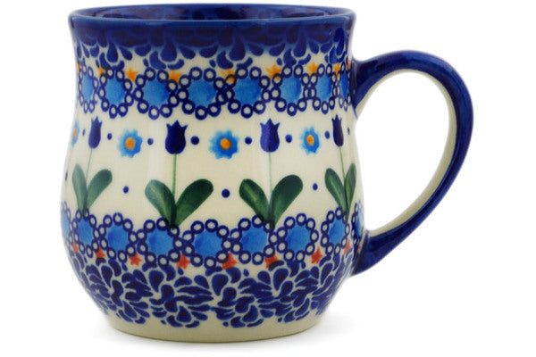 This Blue Tulip Garden 11 oz Mug was handmade and hand decorated in Boleslawiec, Poland by skilled artisans according to old traditional methods. This is a Polish pottery Signature Unikat, which means that it has been hand painted with both sponges and brushes and it is signed by the artist who painted it. Unikat pieces are the most intricate works of art. Larger Unikat items take hours of very careful work to finish. This Polish stoneware is microwave, dishwasher, freezer, and oven safe up to 480°F. It does not contain lead or cadmium. It is part of the Blue Tulip Garden Collection.