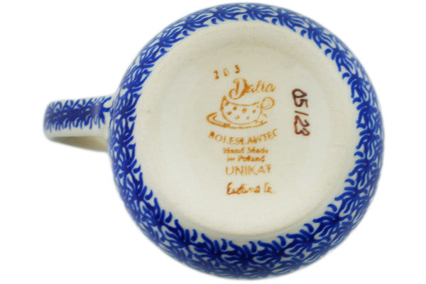 This Blue Floral Day 12 oz Mug was handmade and hand decorated in Boleslawiec, Poland by skilled artisans according to old traditional methods. This is a Polish pottery Signature Unikat, which means that it has been hand painted with both sponges and brushes and it is signed by the artist who painted it. Unikat pieces are the most intricate works of art. Larger Unikat items take hours of very careful work to finish. This Polish stoneware is microwave, dishwasher, freezer, and oven safe up to 480°F. It does not contain lead or cadmium. It is part of the Blue Floral Day Collection.