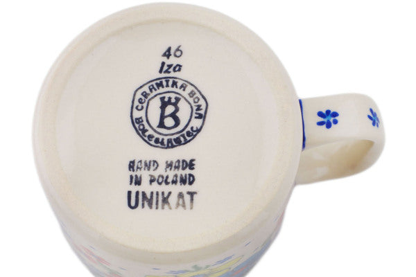 This Country Three 13 oz Mug was handmade and hand decorated in Boleslawiec, Poland by skilled artisans according to old traditional methods. This is a Polish pottery Signature Unikat, which means that it has been hand painted with both sponges and brushes and it is signed by the artist who painted it. Unikat pieces are the most intricate works of art. Larger Unikat items take hours of very careful work to finish. This Polish stoneware is microwave, dishwasher, freezer, and oven safe up to 480°F. It does not contain lead or cadmium. It is part of the Country Three Collection.