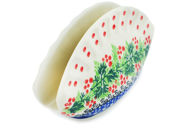 This Blooming Rowan 5" Napkin Holder was handmade and hand decorated in Boleslawiec, Poland by skilled artisans according to old traditional methods. This Polish stoneware is microwave, dishwasher, freezer, and oven safe up to 480°F. It does not contain lead or cadmium. It is part of the Blooming Rowan Collection.